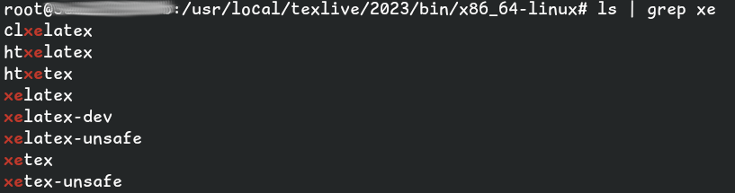 可以观察到,即使是更新了完整的LaTex,在系统的PATH中仍然没有XeLaTex(在/bin/中有xetex,但是Overleaf无法识别)。因此我们只需要创建从Texlive目录到/usr/local/bin的软链接即可。首先进入Texlive的二进制可执行文件目录,查看XeLaTex的相关文件是否存在(如果不存在,则需要执行维护中的更新步骤):