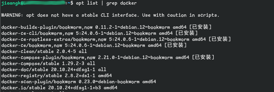 即可安装Docker。在执行完以上命令后,运行apt list | grep docker命令(笔者使用的是Debian系统,因此默认的高级包管理器是apt,如果使用非Debian系系统需要使用其他命令),可以看到