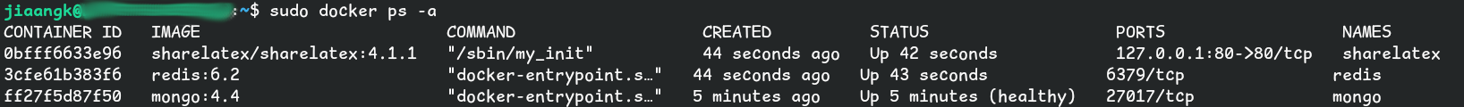 在设置完成之后,Overleaf默认是开机自启动的,这会消耗大量的系统资源。如果要禁用开机自启动,只需要禁用相应Docker容器的自启动即可: