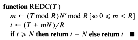 定义Montgomery约减 $REDC(T) = TR^{-1} \ mod \ N$ 。其中 $R > N$ 且 $gcd(N, R) = 1$ , $R^-1$ 为 $R$ 在模 $N$ 意义下的逆元,即 $RR^{-1} \equiv 1 (mod \ N)$ 。取 $N’$ 使得 $RR^{-1} - NN’ = 1$ ,由模运算的定义这样的 $N’$ 显然存在。算法的输入 $T$ 保证 $T < NR$。